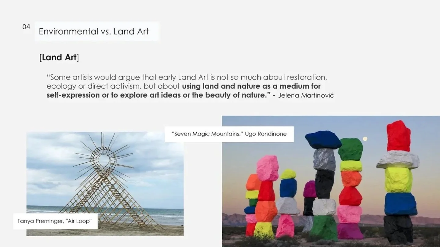 Contemporary Expressionist painter, Jelena Martinović describes land art as, “using land and nature as a medium for self-expression or to explore art ideas or the beauty of nature.” This style of artwork certainly can encourage folks to appreciate the natural world which inspires them to advocate for their local habitat, but it is not a direct call out to how human presence has altered natural spaces.